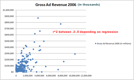 Run the standard deviations on ad revenue by print publication circulation and you’ll see that the prices do not correlate to audience very well. There’s some accounting for composition+audience but even that is dubious. And, no, ad pages (akin to impressions/pageviews online) has almost no correlation either. See below graph for circulation (x axis) against annual ad revenues (y axis)